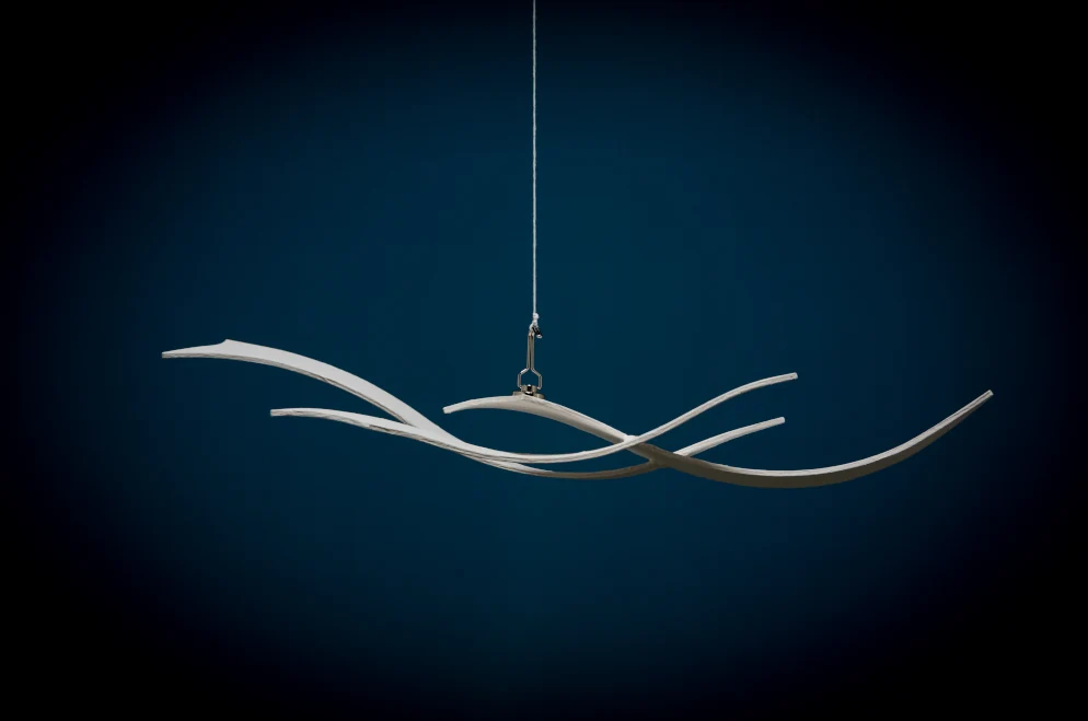 A veces la ingravidez, el flotar parece contrario a la escultura metálica. El infinito horizontal nos habla del vacío que lo mantiene flotando.